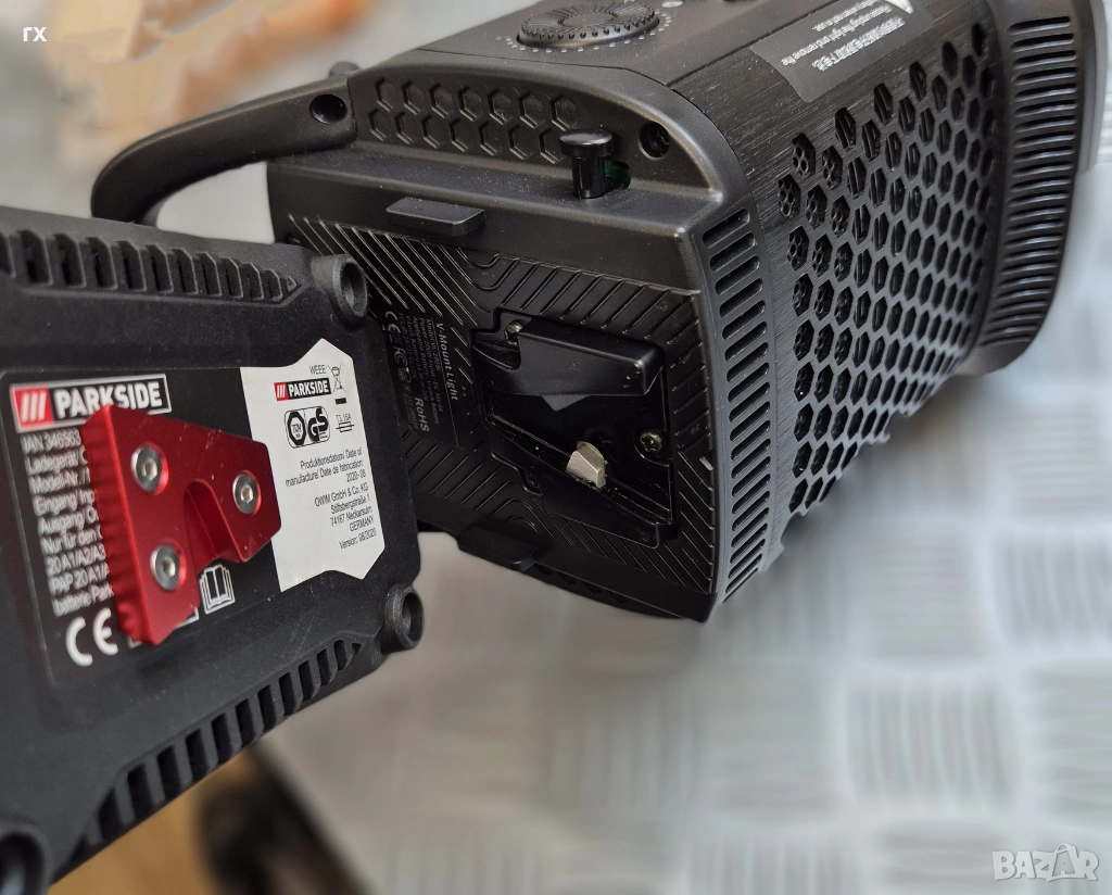 Ulanzi VL-200Bi 200W Video Light нова, но не може да се ползва с V-Mount батерия поради счупване на конектор, модифицирана е да работи с Parkside x20 батерии с яркост до 50%
