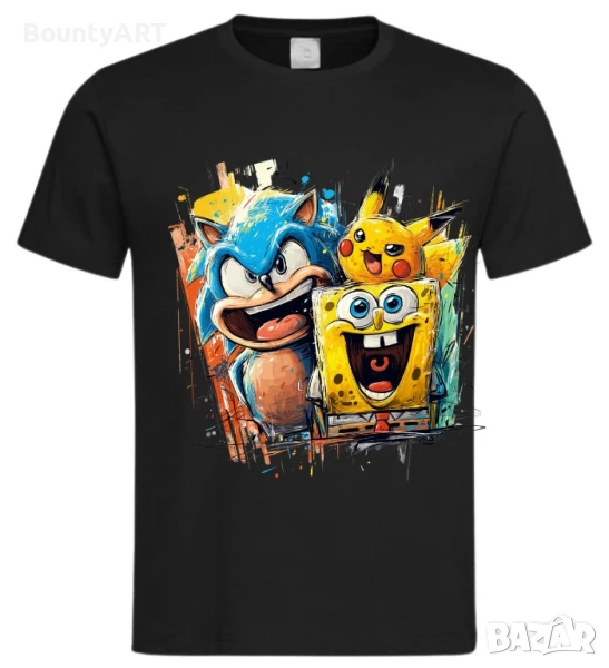 Графити тениска, която съчетава трима любими герои: Соник, Пикачу и Спонджбоб, енергични,наситени цветове и динамични щрихи, които придават усещане за движение и забавление.