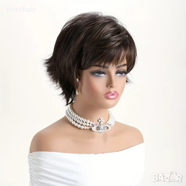 Къса дамска тъмно кафява перука с фини руси кичури → Обява 50540353