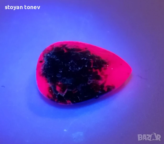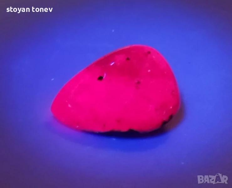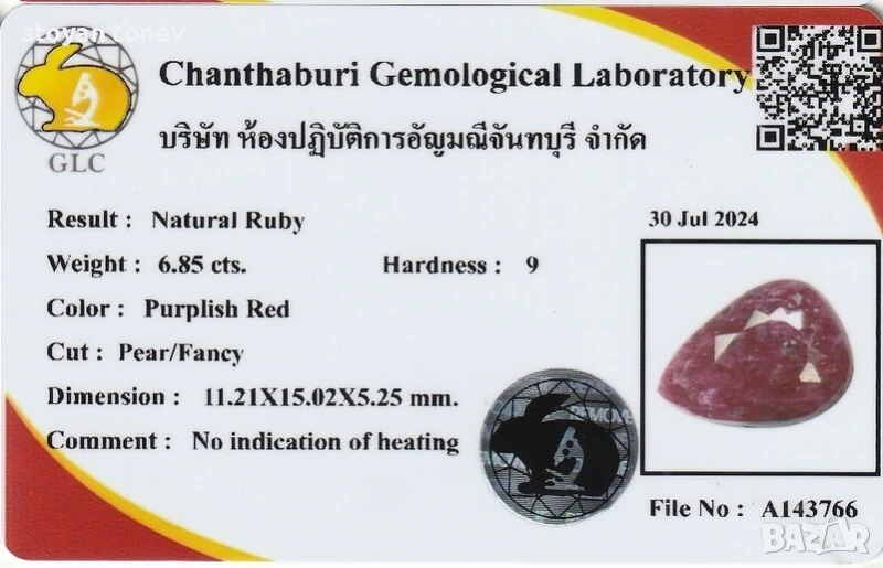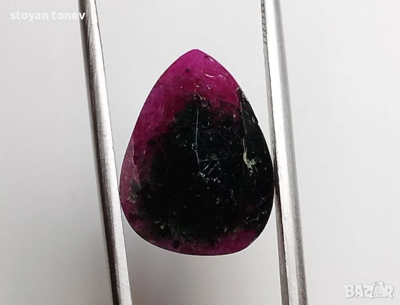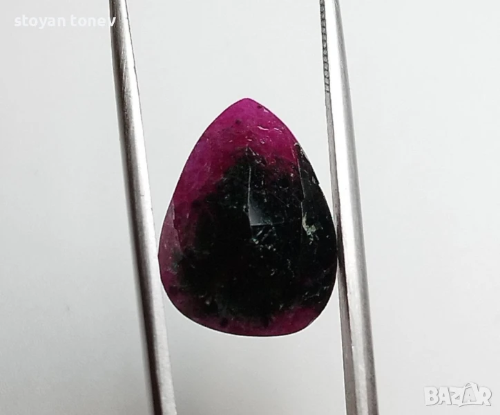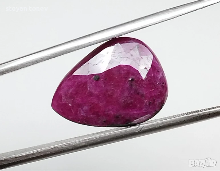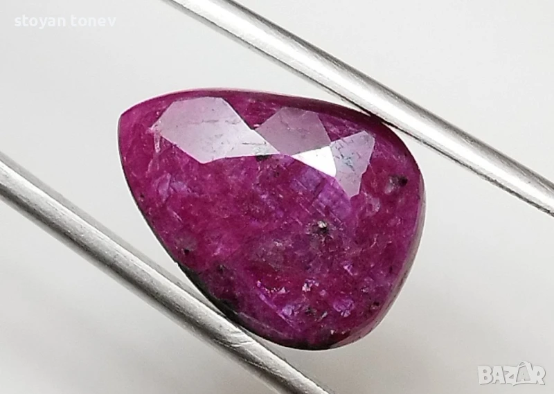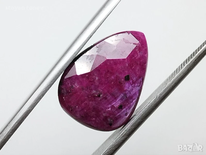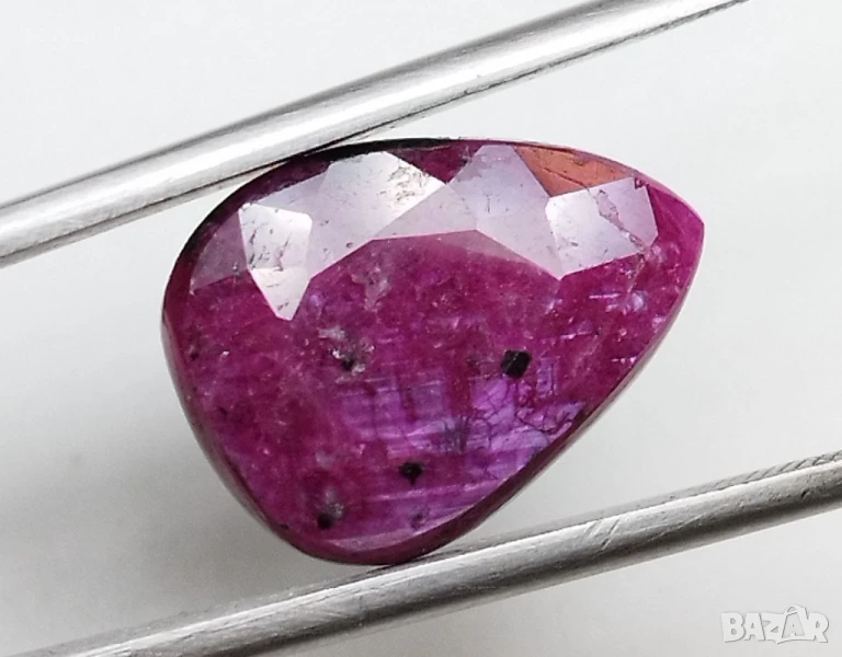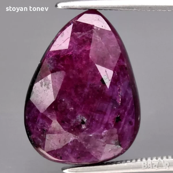 Естествен рубин с тегло 6.86кт. и произход Африка. Полупрозрачна чистота с видими елементи на растеж на кристала. Цвета е лилавеещо червен. Форма круша с размери: 15.02 x 11.21 x 5.25 mm.