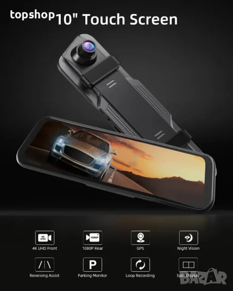 видеорегистратор за обратно виждане UHD 2160p/30fps. Записваща DVR камера за кола с разделен дисплей, сензорен екран, GPS, монитор за паркиране, нощно виждане, помощ при резервиране, 64GB SD карта, USB C порт