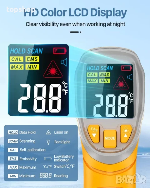 [Многофункционален дизайн] С функция за макс./мин. и задържане на данни, превключване на единиците (°C/°F), диапазон на калибриране на температурата между -3°C ~ 3°C. Всеки IR температурен пистолет има голям цветен LCD екран с подсветка за лесно отчитане на температурата дори на тъмно и 10-секундно автоматично изключване за удължаване на живота на батерията, така че да не останете без енергия случайно.