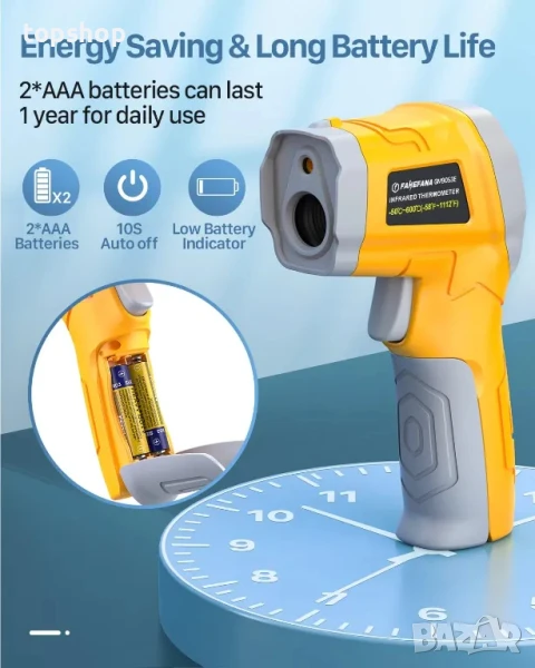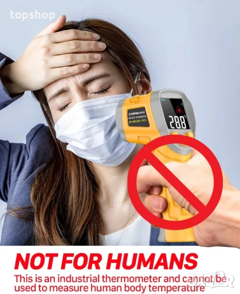 Не е за хора: Този термометър е индустриален термометър и не може да се използва за измерване на телесната температура. Стойността на измерване, измерена от пистолета за измерване на температура, е повърхностната температура на предмети и течности и не може да измери вътрешната температура, така че измерената температура на хора или животни е неточна. Предназначен за домашни ремонти, готвене и други домашни дейности.