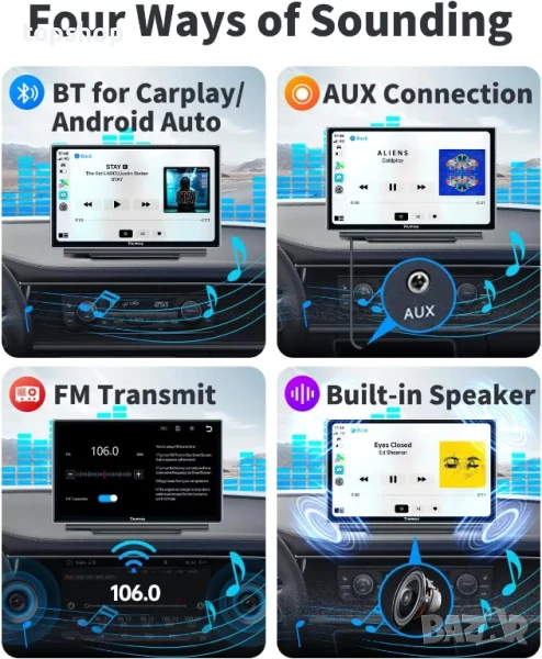 Множество аудио изходи: не само вграденият високоговорител, но нашият carplay екран също поддържа множество аудио изходи, включително Bluetooth (за Carplay и Android автомобил), FM предаване и AUX изход, който ви предлага гъвкави опции, за да се наслаждавате на любимата си музика и аудио съдържание.