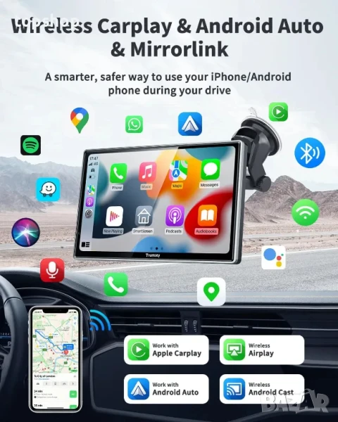 Безжична свързаност: с функциите за безжичен CarPlay, Android car, Airplay, Android Cast и Bluetooth можете лесно да свържете телефона си с радиото в колата, без да е необходим кабел за данни. Гласовият контрол ви позволява да се съсредоточите върху пътя, докато имате достъп до любимите си приложения и функции.