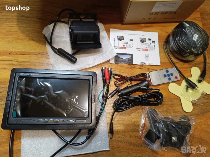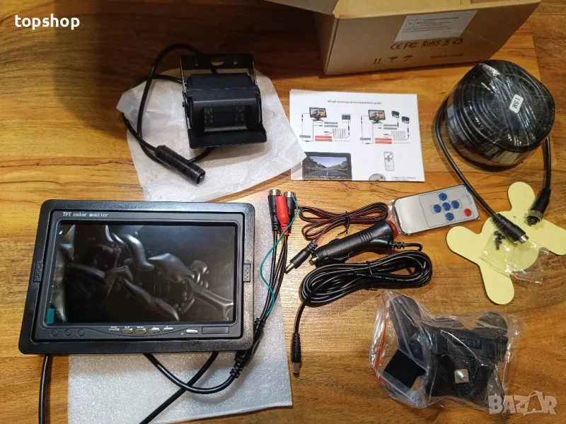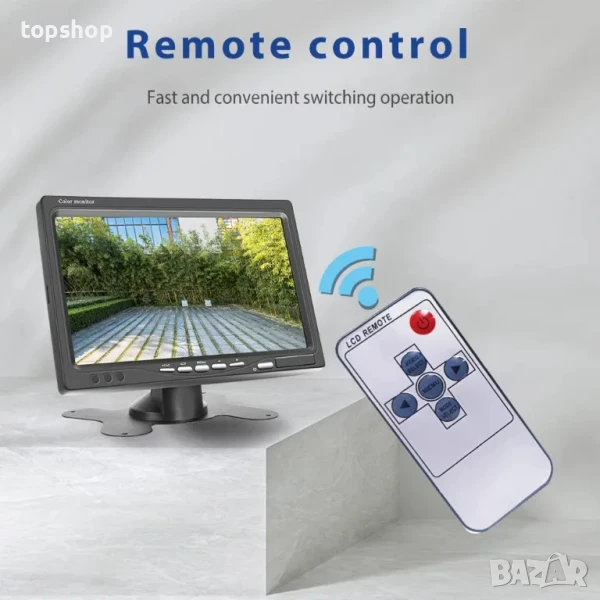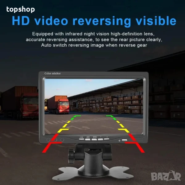 камера за задно виждане】7" цветен TFT LCD монитор + 18 IR LED нощна камера за задно виждане + 4-пинов кабел за свързване. Твърдото свързване гарантира безопасно, ясно и стабилно изображение при задно виждане. Доставя се с дистанционно управление и стойка.