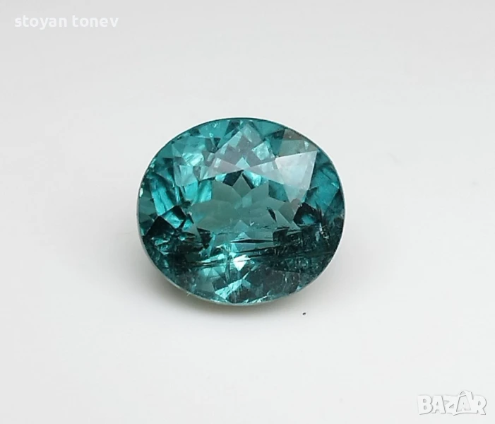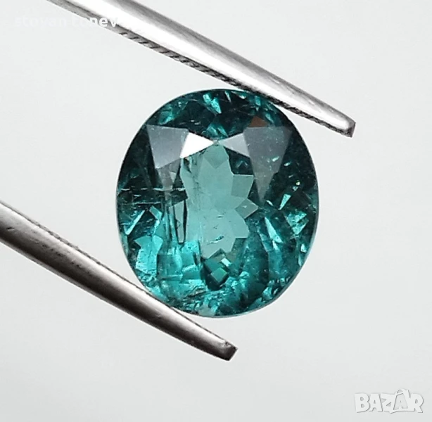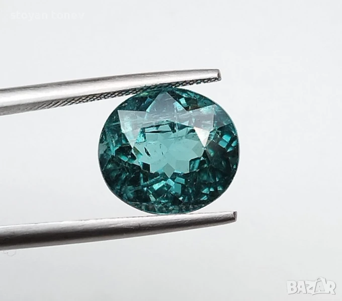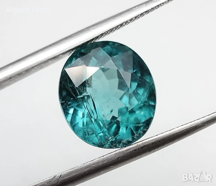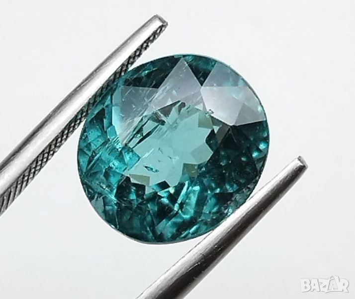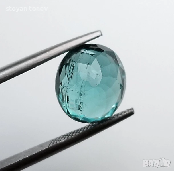 Естествен турмалин с тегло 3.74кт. и произход Африка. Чистота SI с видими включения. Цвета е зелено син. Овална форма с размери: 9.59 x 8.58 x 6.64 mm.