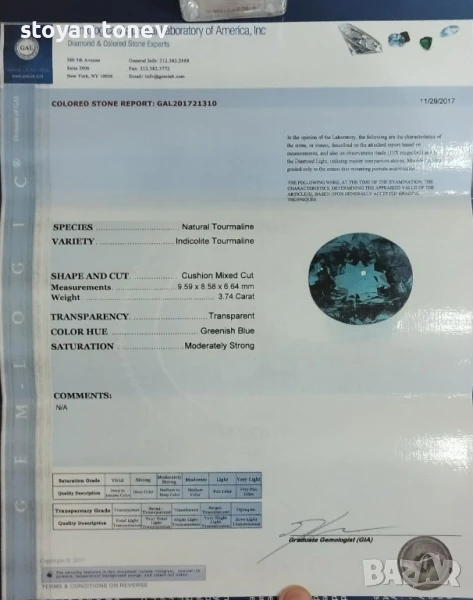 Ненагряван. Сертифициран от GAL - Gemological Appraisal Laboratory of America,Inc.