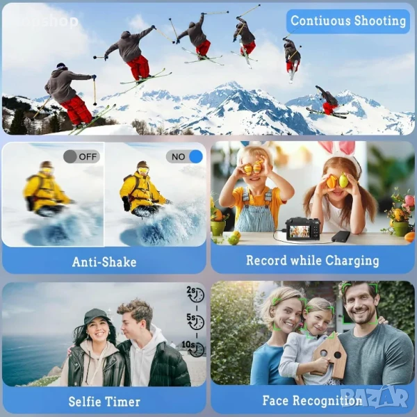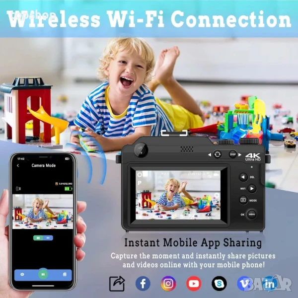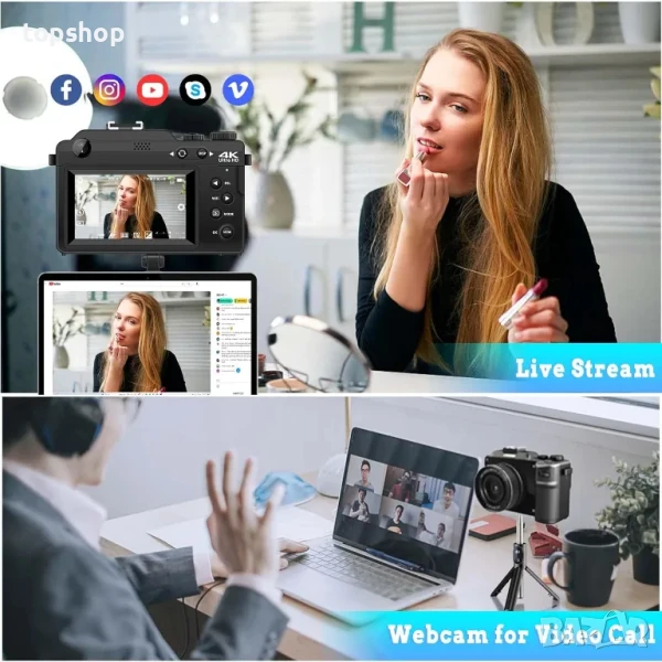 Камера за Vlogging с автоматичен фокус и стабилизиране на трептенето: Нашата цифрова камера предоставя видео с висок битрейт с 4K резолюция и ясно изображение от 48MP, без да пропуска нито един детайл. 4k камерата поддържа и 18x цифрово увеличение, само с едно щракване за заснемане на истински снимки с автоматичен фокус и анти-трепване. Безплатната каишка за китка, която може да увие удобно пръста ви, предотвратява падането на видеокамерата.