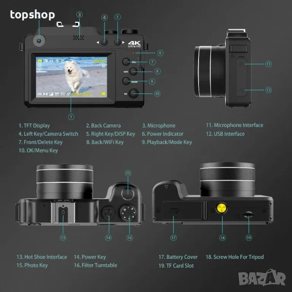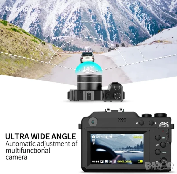 TEKXDD Оригинален широкоъгълен обектив: С вградения широкоъгълен обектив този фотоапарат за фотография може да заснеме още 45 изображения с всяка моментна снимка. Няма нужда да носите тежки лещи, което значително намалява тежестта ви при пътуване. С тази 4k камера можете да правите зашеметяващи снимки на хора, пейзажи, селфита и други