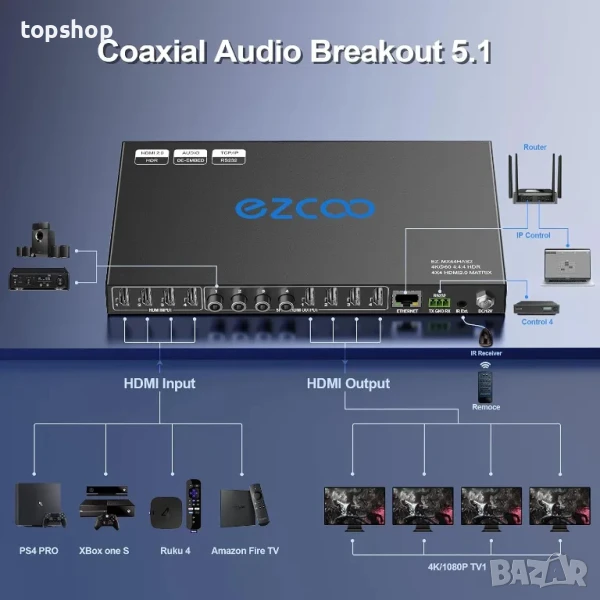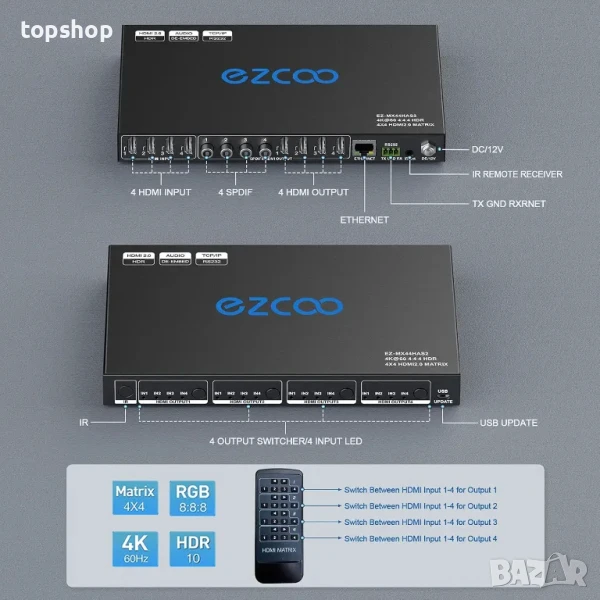 ЧИСТО НОВ EZ MX44HAS2 HDMI матричен суич / превключвател 4X4 4K 60Hz 4:4:4 HDR Коаксиален аудио канал - HDCP 2.2 HDMI 2.0 4x4 матрица 18Gbps с IR Receiver Дистанционно, IP контрол, RS232, Възможност от 4K до 1080P резолюция. Поддържа MX44-HAS2