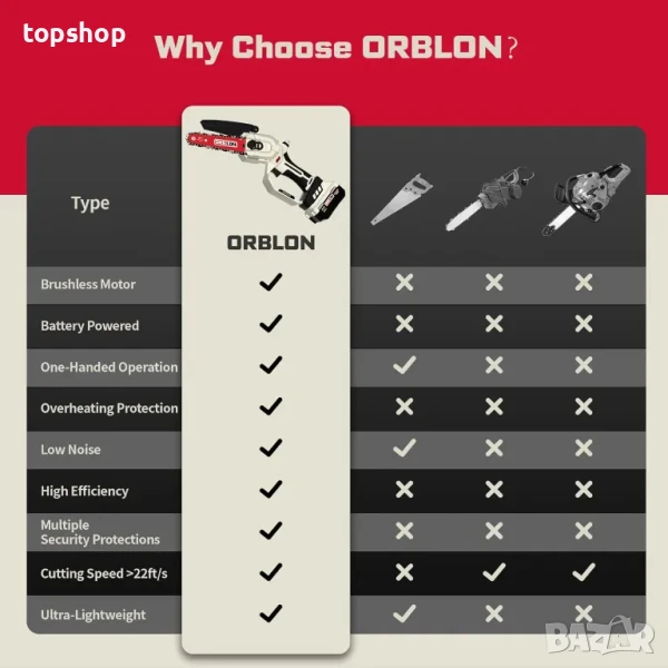 Второ поколение безчетков двигател и система за смазване: Инструментите ORBLON са надградени с чисто ново второ поколение безчетков двигател, който може да се използва дълго време и никога не изгаря, с нарастваща мощност! С инверторния безчетков двигател се насладете на нисък шум и висока ефективност при рязане. В допълнение, този верижен трион има добавена система за смазване, за да поддържа веригата идеално смазана и скоростта на веригата до 32 FT/s, което прави работата ви по-ефективна