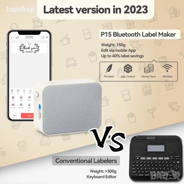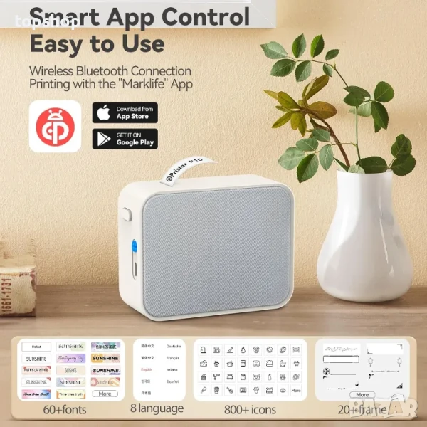 Bluetooth принтер за етикети: Портативен принтер за етикети P15 е с размери 9,5x7,9x4 cm и тегло 150g. Лесен за носене, така че можете да отпечатвате стикери навсякъде и по всяко време. Bluetooth 4.0 връзка, ефективно разстояние на връзката до 10 m