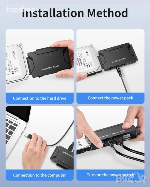 Универсална съвместимост: Адаптерът поддържа Windows 10/8/7/Vista, Linux, Mac OS 9.0 до 10.13.3, PS4, Xbox One. Широко съвместим с всички видове SSD и HDD, включително Western Digital, Seagate, Toshiba, Samsung. Работи и с DVD-ROM, CD-ROM, CD-RW, DVD-RW, DVD+RW и др. Поддържа четене и запис на три устройства едновременно.