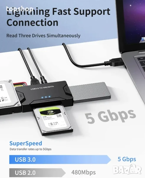 USB 3.0 5Gbps Супер скорост: IDE към USB адаптер е оборудван с USB 3.0 интерфейс, който поддържа скорости на трансфер на данни до 5Gbps, достатъчно бързо, за да прехвърлите филм за секунди. Също така е обратно съвместим с USB 2.0 и USB 1.1. Забележка: Действителната скорост на трансфер е ограничена от настройките на свързаното устройство и компютъра.