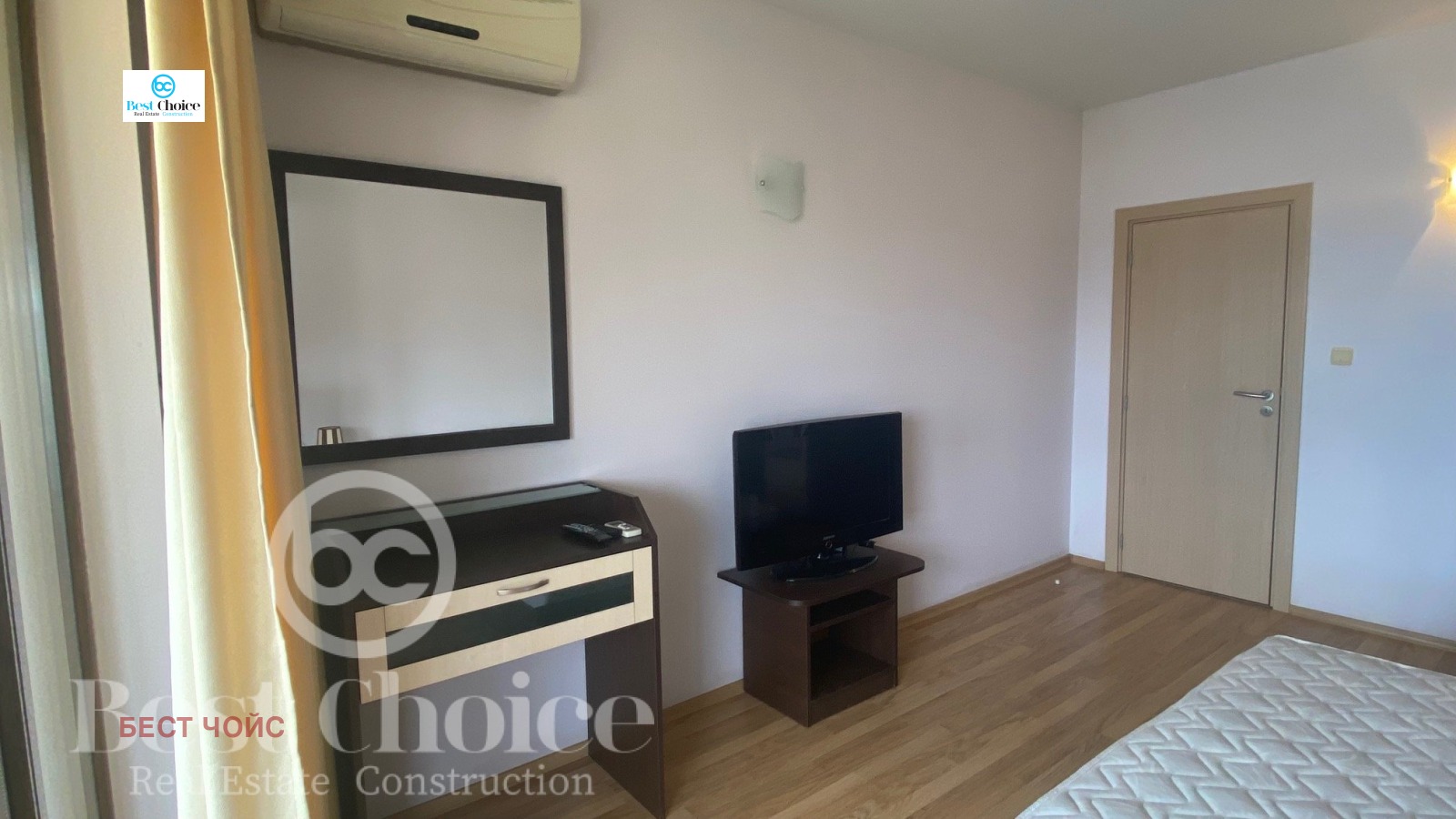 Спални - двойно легло, две нощни шкафчета, гардероб, телевизор, тоалетка, климатик.