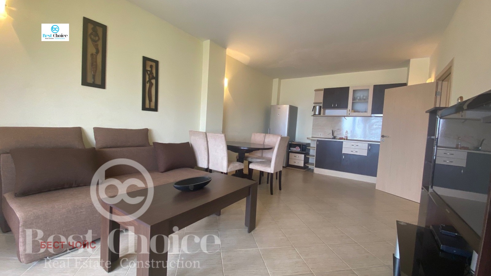 Всекидневна - мека мебел, холна маса, маса и столове за хранене, тв шкаф, телевизор, климатик.