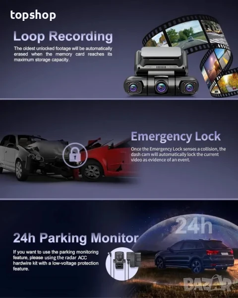 4-Channel 360 ° Front, Rear and In-Cabin Dash Camera - Four-channel FHD 1920*1080P dash camera with 150 ° ultra wide-angle lens and 3-inch LCD display provides clear movies and images even at high speeds. The center dashboard camera records the front and side of the vehicle, and the two cabin cameras are free to change the recording angle and rotate left and right to cover more angles.