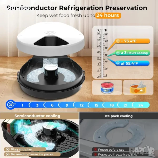 24-часово интелигентно запазване на свежестта: Автоматичната хранилка за мокра храна UBPet F10 използва усъвършенстван полупроводников хладилен чип, който елиминира досадната операция по смяна на ледени пакети и многократното им замразяване. Поддържайте храната свежа лесно и непрекъснато, без да се притеснявате за разваляне на храната, позволявайки на вашия домашен любимец да яде прясна храна през целия ден. 3 температурни настройки поддържат температурата на храната от 10 до 15°C. Това е правилният избор за хранене с мокра храна.