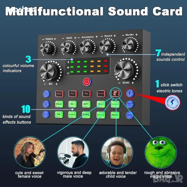 【богати звукови ефекти и 4 гласови промени】-- миксерът за аудио интерфейс има 4 вариации на звука (женски、мъжки、дете и чудовище) и може да произведе 10 звукови ефекта. тези звукови ефекти добавят повече забавление към вашето предаване на живо. в допълнение миксерът на подкаст има 4 звукови режима, 13 функции. съдържа почти всички често използвани функции, които са предназначени за запис, подкастинг, поточно предаване на живо и др.