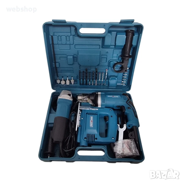 KraftRoyal 3-инструмента, 220 V, ъглошлайф 11000 rpm 125 mm 1200W, трион с махало 1200W 3000 RPM