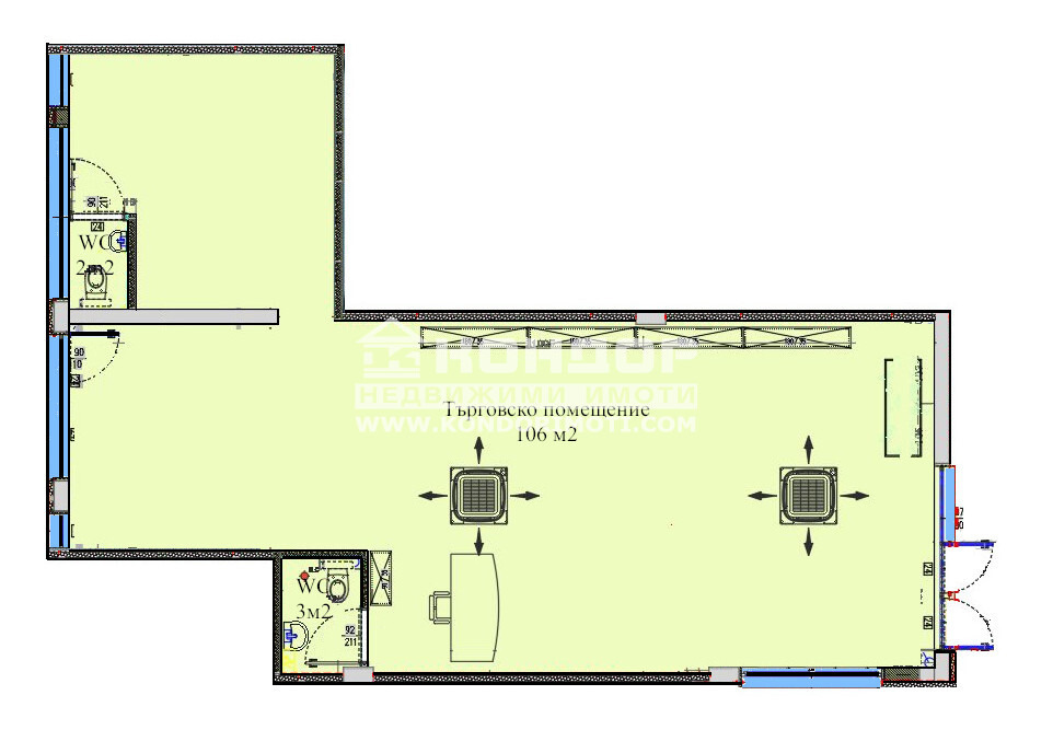 Разположение: Търговският обект е с лице към улица, височина 3.40 м., състои се от едно Г - образно помещение с площ от 106кв.м. с възможност да се обособят две зали и два санитарни възела. Имота е подходящ за ресторант, пицария, сладкарница и други. Към търговското помещение има възможност да се наемат партерни паркоместа за клиентите или да се оформи лятна градина!