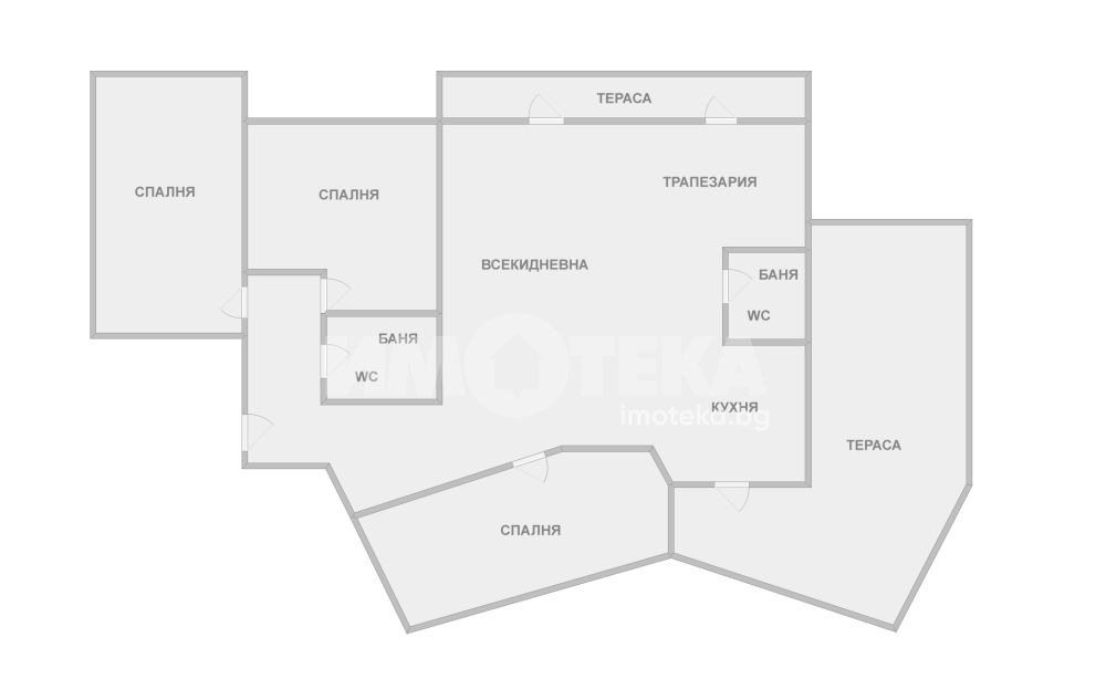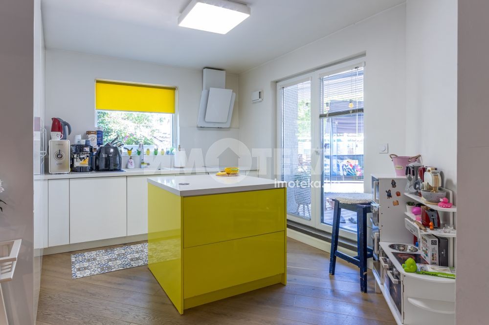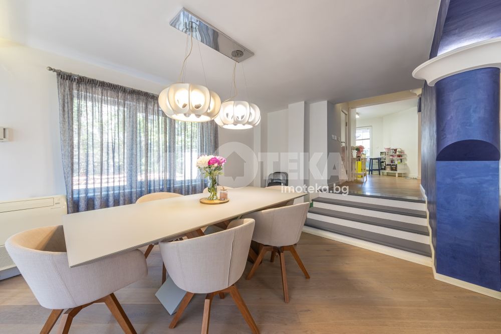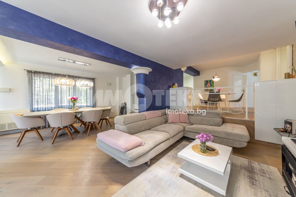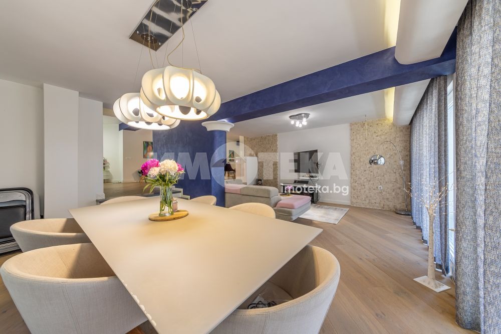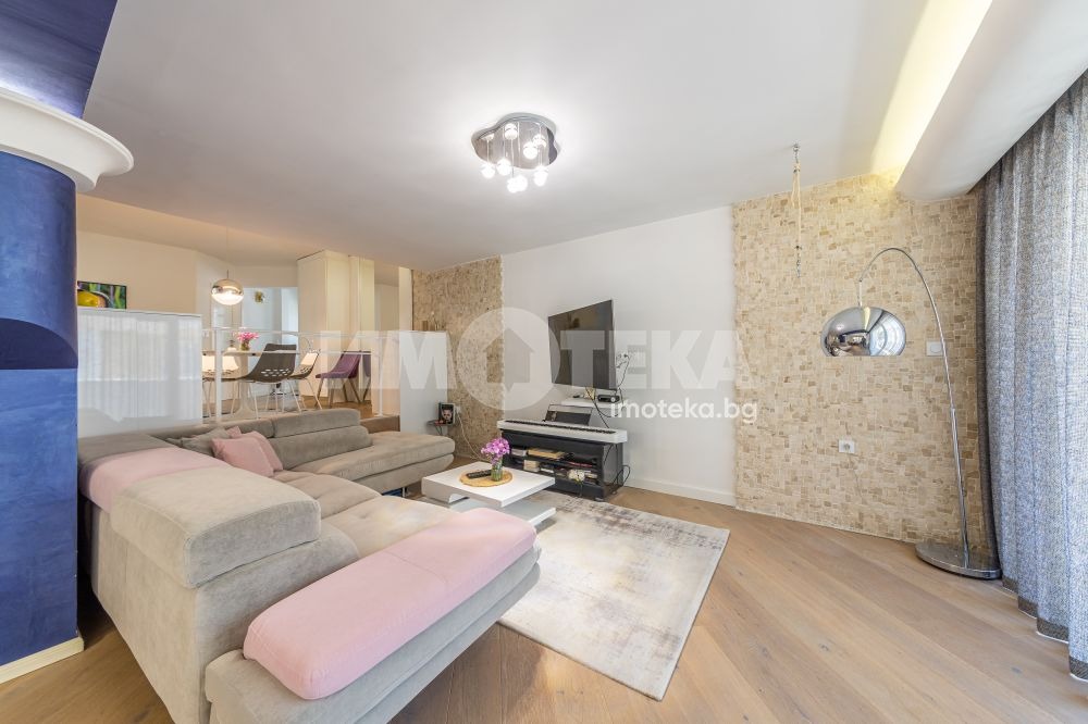 Жилището се състои от просторна дневна, хол, кухня с трапезария, три спални, просторен коридор, перално помещение, килер, голяма тераса и два лицеви гаража. Към имота има и таванско помещение 4,50 кв.м.