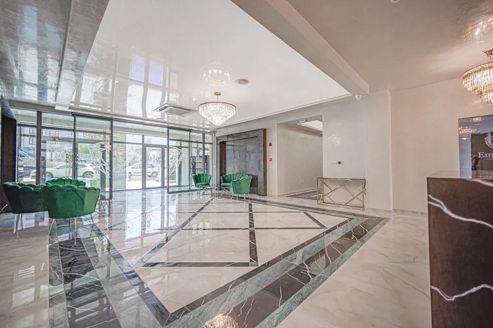 Разпределение: входно антре, кухненски бокс с хол и трапезария, две спални със собствени баня с тоалетна и гардеробна. трета спалня със собствена баня с тоалетна, баня с тоалетна за гости, мокро помещение и две тераси