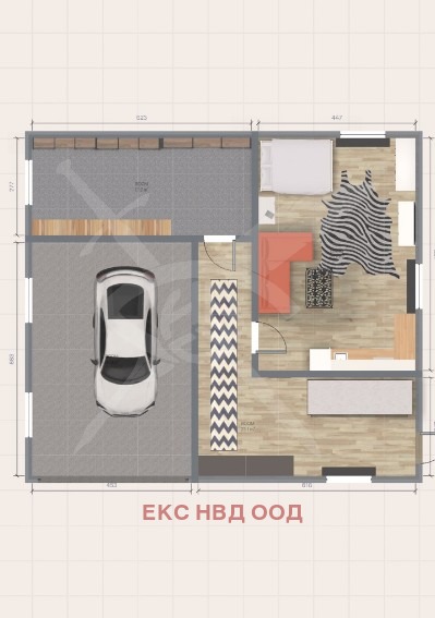 Партер - коридор, голяма стая, баня с тоалетна, мазе, гараж ;Първи и Втори етаж - коридор, баня и тоалетна, кухня, хол, спалня, детска стая, две тераси; Таван - еднопространствено помещение.