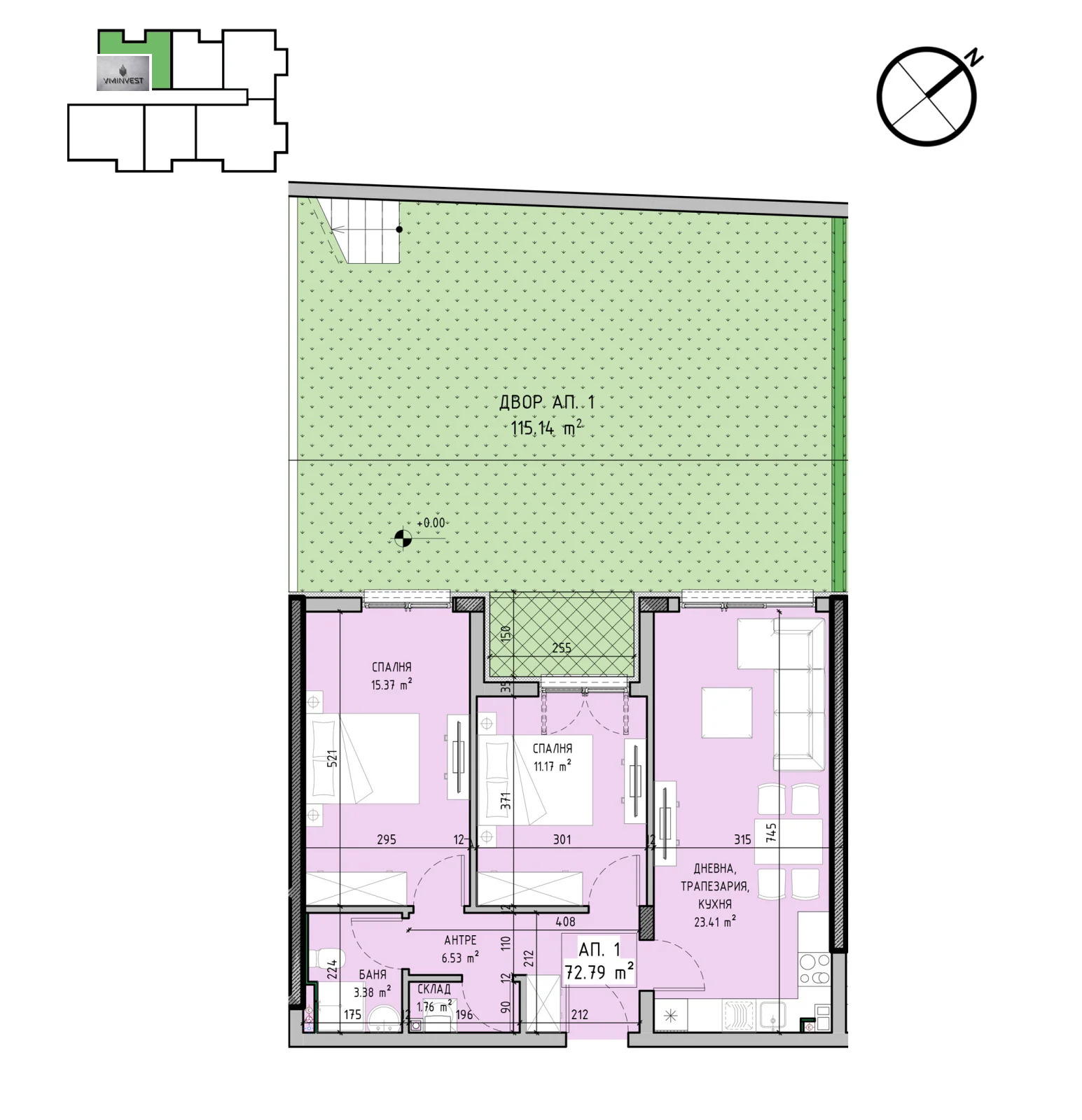 Разпределение: антре /6,53 кв.м./, дневна с кухненски бокс /23,41 кв.м./, спалня /11,17 кв.м./, втора спалня /15,37 кв.м./ баня с тоалетна /3,38 кв.м./, складово помещение /1,76 кв.м./ и прилежащ двор /115,14 кв.м./.