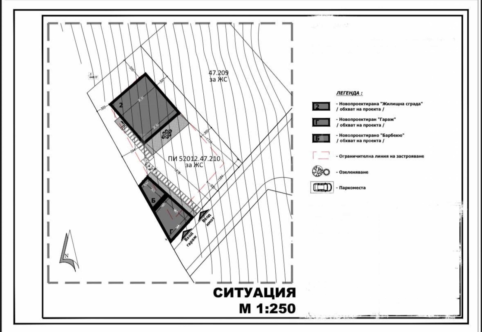 Имотът се простира върху равен парцел с площ от 680 кв.м, върху който са предвидени: