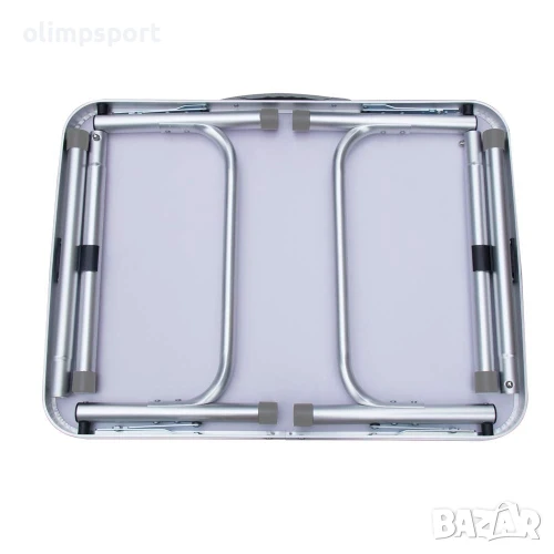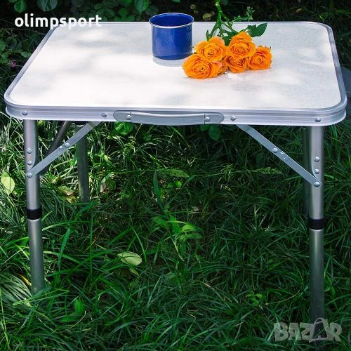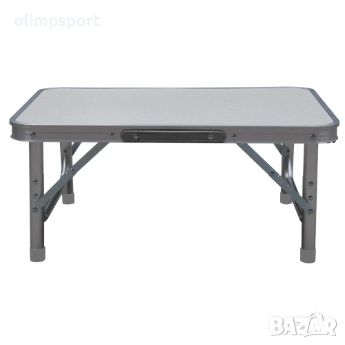 Къмпинг маса сгъваема нова, 60х45хH26.5/56.5 см. Лека, удобна за пренасяне (разполага с дръжка за носене), водоустойчива и термоустойчива. Не е предвидена да поддържа чадър. Ако се използва такъв, той трябва да има отделна стойка. Височината се регулира чрез добавяне или премахване на допълнителни крачета, които се закрепват под плота, когато не се използват. Да се съхранява на сухо. Преди употреба да се проверят за повреди рамката, скрепителните, подвижните и заключващите части. Размери плот - 60х45 см. Височина - 26.5 см или 56.5 см. Размери сгъната – 60х46х3 см. Дебелина профил крак – 19 мм и 25 мм. Размери кутия – 61х48х4 см. Тегло нето – 2 кг. Тегло бруто – 2.3 кг. Материал – алуминиев борд, алуминиеви крака, плот от гетенакс.