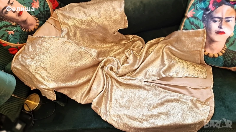 Потопете се в лукса на арабската елегантност с тази дълга, изключително нежна рокля, изработена от фина материя с блестяща нишка, напомняща на течно злато. Тя прелива и играе с цветовете си, създавайки магическо огледално отражение, което пленява с всяко движение.