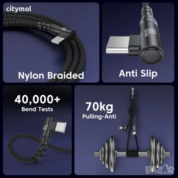 Кабелът е изработен от много здрави материали и допълнително е оплетен със здрав найлон, за да се предотврати заплитане. Освен това найлоновата оплетка е устойчива на износване и механични повреди, което осигурява дълъг живот.