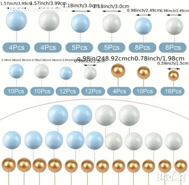 108 броя топчета топки на тел от стиропор за декорация на торта сини бели златисти → Обява 50547400