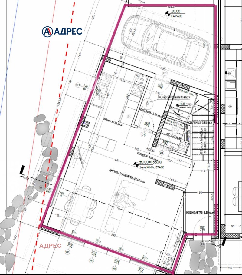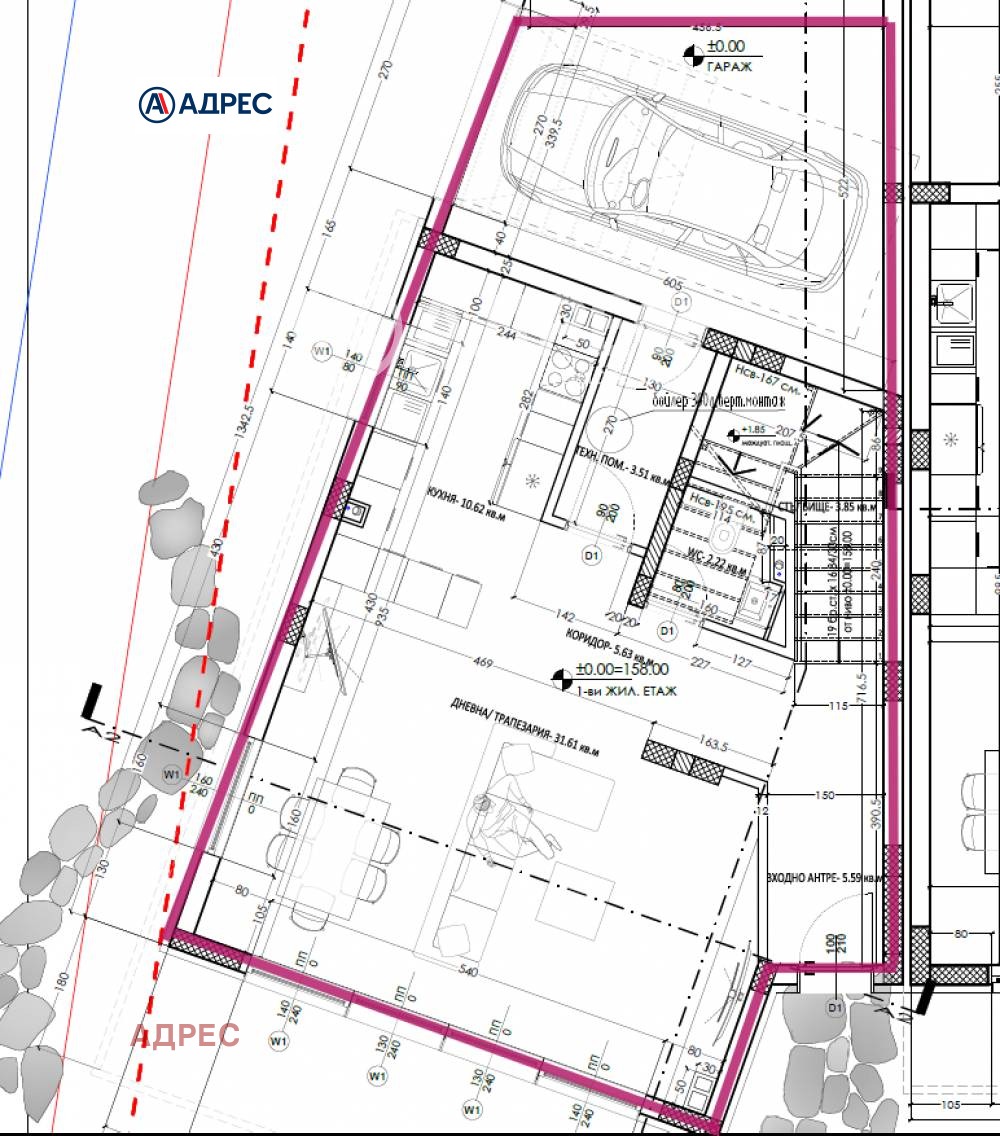 Етаж 1: просторна и светла дневна с кухня, сервизно помещение и мокро помещение