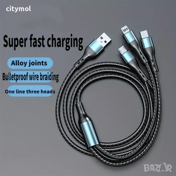 Супер практичен кабел 3 в 1 за до 120W бързо зареждане.
