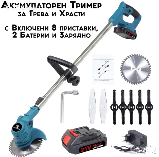 Акумулаторен тример✔ Батерия 21V 4Ah✔ Зарядно устройство✔ Инструкции за употреба🛡️ Гаранция: 24 месеца – за пълно спокойствие и доверие в избора ти.🚚 Бърза доставка до всяка точка на страната – градината ти няма да чака!