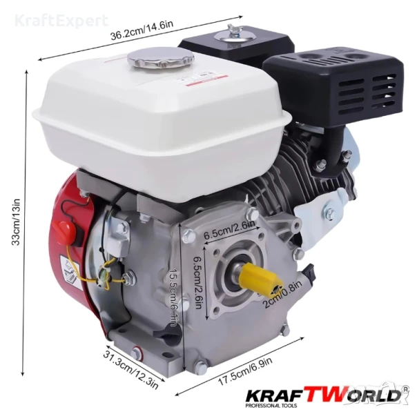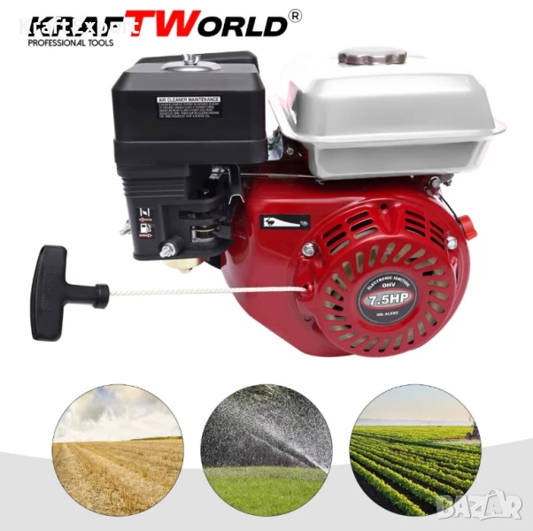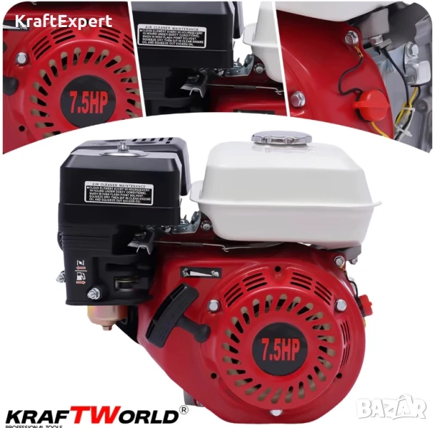 мотофреза, мотокултиватор, мотопомпа или генератор, KRAFTWORLD 7.5HP (196 куб.см) е перфектният избор!🔧 Основни характеристики:✅ Мощност: 7.5 к.с. при 3600 об./мин – осигурява оптимална производителност за разнообразни приложения.✅ Двигател: четиритактов с въздушно охлаждане – гарантира ефективна работа и дълъг експлоатационен живот.✅ Датчик за маслото: автоматично изключване при ниско ниво на масло – предпазва двигателя от повреди.✅ Икономичен разход на гориво: резервоар 3.5L – позволява продължителна работа без често зареждане.✅ Включена шайба: позволява лесно и бързо свързване с ремъчна предавка, улеснявайки интеграцията с различни машини и аксесоари.📐 Технически спецификации:Обем на двигателя: 196 см³Диаметър на цилиндъра: 68 ммХод на буталото: 54 ммСтепен на компресия: 8.5:1Размер на вала: 19 мм диаметър, 58 мм дължина (хоризонтален вал)Стартиране: ръчен стартОбем на смазващата система: 600 млНиво на шума: 78 dBТегло: 16 кгРазмери: 390 x 330 x 350 мм⚙️ Предимства:Лек и компактен дизайн – улеснява монтажа и транспортирането.Ниско ниво на шум – подходящ за работа в населени места и чувствителни зони.Здрав хоризонтален вал – осигурява надеждност и дълготрайност при интензивна употреба.Включена шайба – спестява време и усилия при инсталацията и свързването с други компоненти.💪 Готов за всяко предизвикателство! Поръчайте KRAFTWORLD 7.5HP (196 куб.см) бензинов двигател с включена шайба и вдъхнете нов живот на вашата техника!📦 Поръчайте сега и работете без компромис!