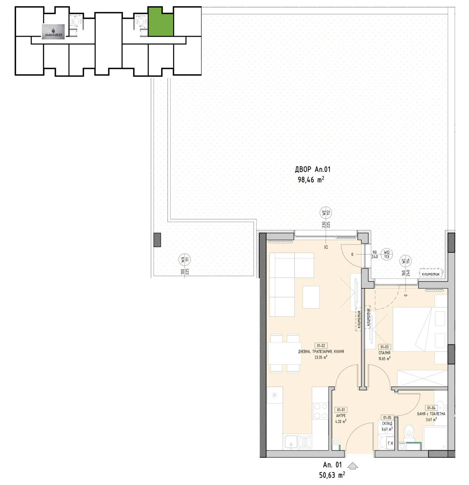 Разпределение: антре /4,20 кв.м./, дневна с кухненски бокс /23,35 кв.м./, спалня /10,65 кв.м./, баня с тоалетна /3,67 кв.м./, складово помещение /0,67 кв.м./ и прилежащ двор /98,46 кв.м./.
