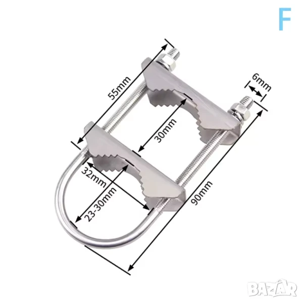 Този монтажен комплект е предназначен за външно закрепване на антена. Включва метална скоба, U-болтове и захващащи винтове, които позволяват стабилно закрепване както на стенa, така и на вертикален стълб или мачта. Конструкцията е изработена от устойчив материал, обикновено поцинкована стомана или алуминий, за да издържа на атмосферни влияния, като влага, слънце и корозия.