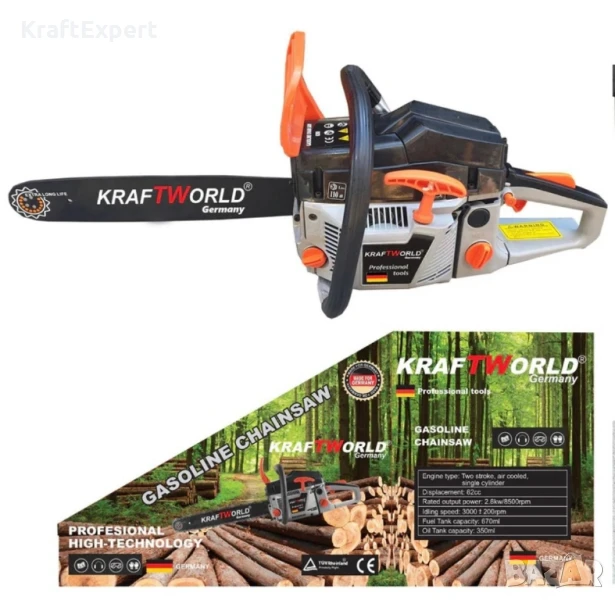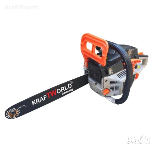 ✅ 24 Месеца Гаранция✅ EasyOn стартер✅ Антивибрационна система✅ Спирачка – Безопасност при отскачанеОткрийте истинската мощ и надеждност с бензиновата резачка KraftWorld – перфектното решение за вашите нужди в рязане на дърва. Създадена за професионалисти и ентусиасти, тази резачка комбинира впечатляваща производителност, безопасност и комфорт.KraftWorld е снабдена с двутактов двигател с въздушно охлаждане, което гарантира висока ефективност и дълъг живот. EasyOn стартовата система прави стартирането лесно и без усилия, дори за начинаещи потребители. Антивибрационната система минимизира умората по време на работа, осигурявайки гладка и безопасна употреба.С тази резачка получавате и регулируема маслена помпа, която удължава живота на веригата, както и пластмасов въздушен филтър, който се мие лесно за допълнителна издръжливост.Технически арактеристики:– Тип двигател: Двутактов– Брой цилиндри: 1– Охлаждане: Въздушно– Обем на цилиндъра: 72 см3– Мощност:5 Конски сили– Максимални обороти: 8500– Запалване: Ръчно – лесно стартиране, резачката пали изключително лесно без нужда от рязко дърпане.– Стартер EasyOn (мек стартер) – стартер с двойна пружина за по-лесно палене– Състав на горивна смес: 25мл двутактово масло в 1 литър бензин– Обем на горивния резервоар: 550 мл.– Обем на масления резервоар: 260 мл.– Тегло без шина и верига: 4 кг.– Спирачка: Блокира веригата в случай на отскачане на резачката по време на работа.– Маслена помпа за автоматично смазване на веригата– Центробежен съединител: 3 челюсти– Водещо колело: метал, отливкаВерига:Дължина: 40 смБрoй пети: 66Стъпка: .325″Дебелина на петата: 1.5 ммС резачката KraftWorld можете да се справите с всяко предизвикателство, независимо дали става въпрос за професионални задачи или лични проекти