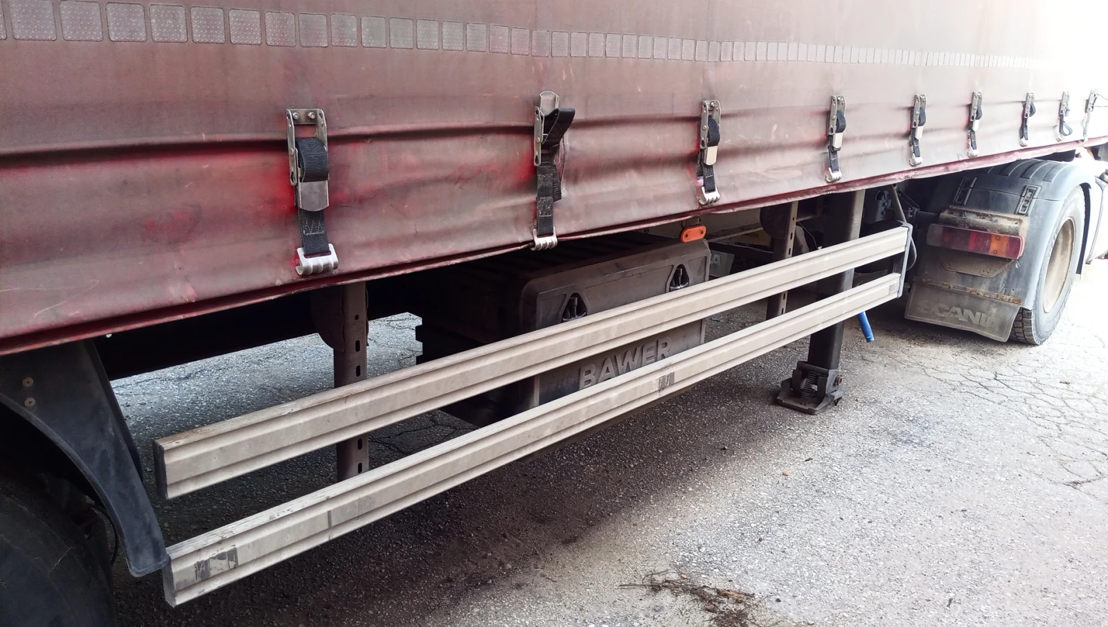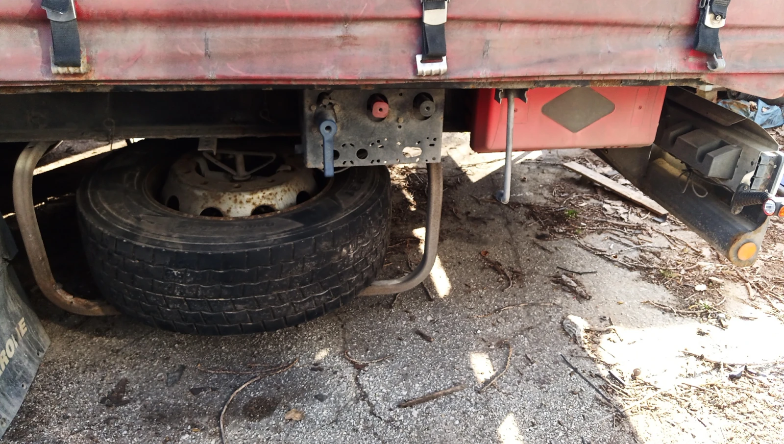 Полуремаркето е с 1-ва ос Буге, 2 стойки за гуми, 2 кутии за пожарогасители, нов сандък за инструменти, нов казан за вода. Страничните мантинели са сменени миналата година. Нови възглавници на бугето. 2 нови диска. Нови накладки на 2-ра и 3-та ос. гумите са 385/65/22. 5 Изтекла гражданска на цялата композиция