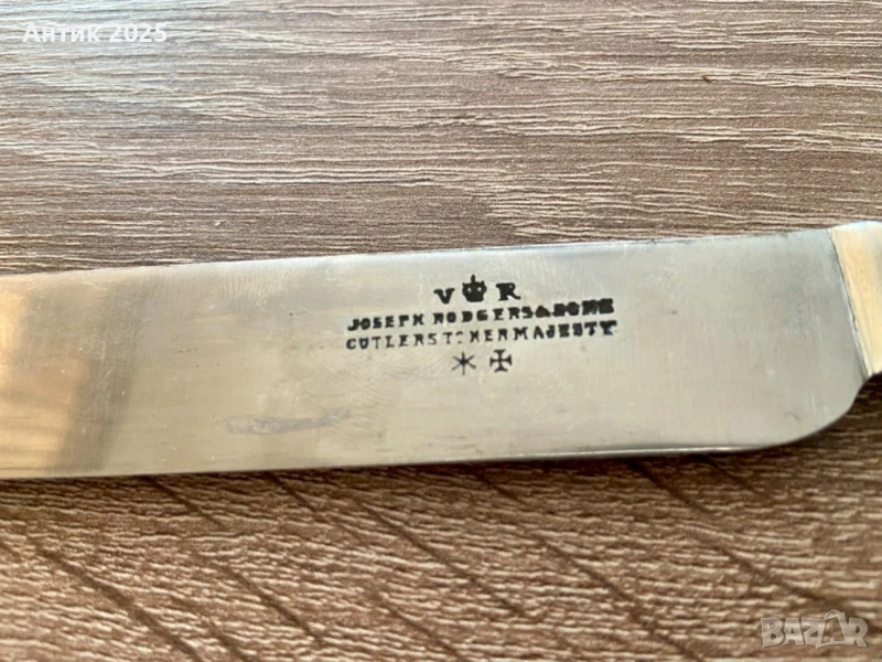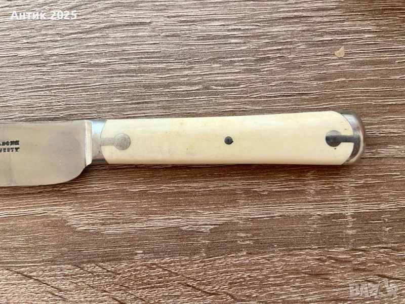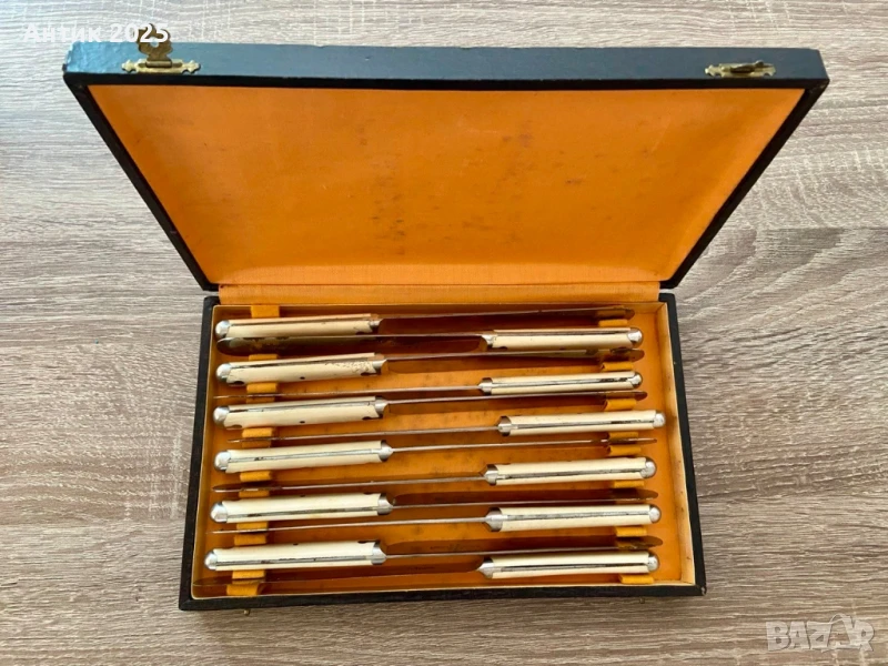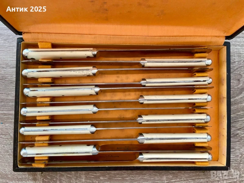 Този винтидж комплект от 12 ножа за маса е с дръжки от естествена кост и се съхранява в оригинален калъф. Стоманените ножове са елегантни и неподвластни на времето, идеални за добавяне на винтидж чар към всяка маса за хранене. Комплектът се предлага с 12 ножа, всеки от които е старателно изработен с висококачествени материали. Идеален за колекционери или за тези, които искат да добавят класическо докосване към своята трапеза.
