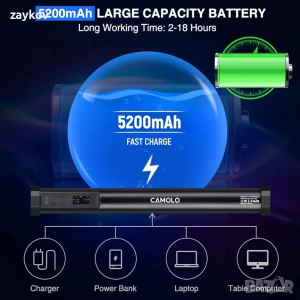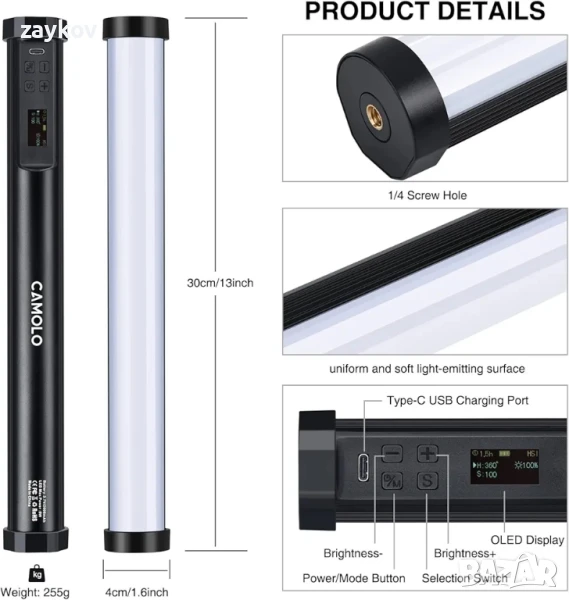 CAMOLO RGB Ръчна светлинна пръчка, преносима LED пълноцветна видео светлина за фотография
