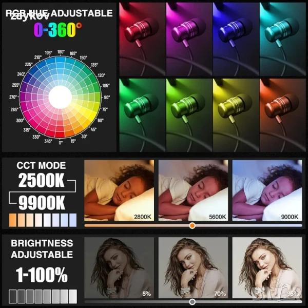 RGB & CCT & 21 сценични ефекта】RGB цвят с регулируема цветова гама от 0° - 360°, яркост от 1% - 100%, цветна температура от 2500K до 9900K. Тази RGB лампа тип пръчка предлага пълни цветове и поддържа 21 сценични режима. Можете да регулирате яркостта и да изберете подходящата цветна температура (студена, естествена, топла светлина) и сценичен ефект в зависимост от вашите нужди. Цветното и ярко фотографско осветление може да създаде разнообразни, цветни и въздействащи атмосфери и да задоволи всички ваши нужди.