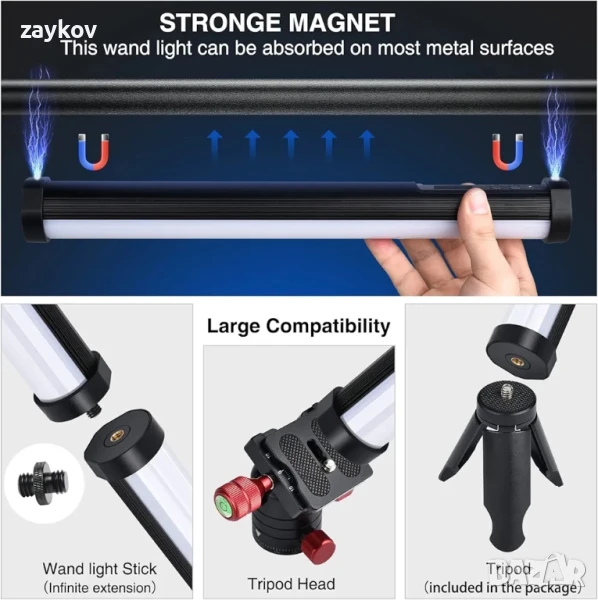 【Широко приложение и голяма съвместимост】Тази LED фотографска лампа е оборудвана с два стандартни отвора за гайки 1/4" в двата края на пръчката, което позволява свързване към друга пръчкова лампа (удължението е безкрайно, но конекторът не е включен в комплекта) и различни адаптери и скоби, като например статив (включен в комплекта), глава за статив и камера. Тази LED и RGB видео лампа може да служи като удобен помощник за фотография, видеозаснемане, рисуване със светлина, концерти, къмпинг и др.