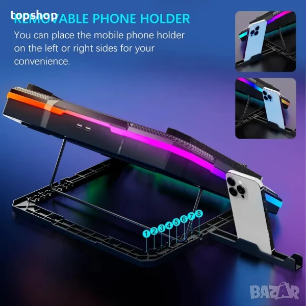 НОВА, ТЕСТВАНА, ПЕРФЕКТНА охлаждаща подложка за лаптоп, мощна турбо вентилаторна RGB охладителна подложка за геймърски лаптопи с 8 регулируеми височини и държач за телефон, за лаптопи 14-19 инча - ледено синя LED светлина