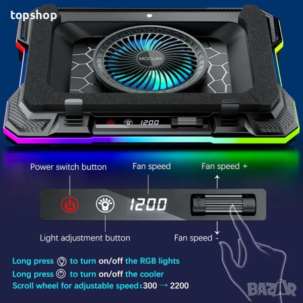Интелигентно управление: Охладителната подложка за лаптоп Moojay C51 разполага с LED дисплей с висока разделителна способност, който показва скоростта на вентилатора в реално време. С чувствителни на допир контроли можете лесно да регулирате мощността и осветлението с едно докосване. Този лесен за употреба дизайн ви позволява без усилие да балансирате охлаждащата производителност и нивата на шум.