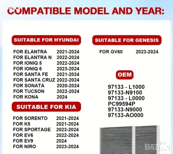 Филтър купе с активен въглен за Киа, Хюндай, Elantra 2021-2024, loniq 5 2022-2024, Santa fe 2021-2024, Sonata 2020-2024, Tucson 2022-2024, K5 2021-2024, замества 97133-L1000, 97133-N9100, 97133-N9000